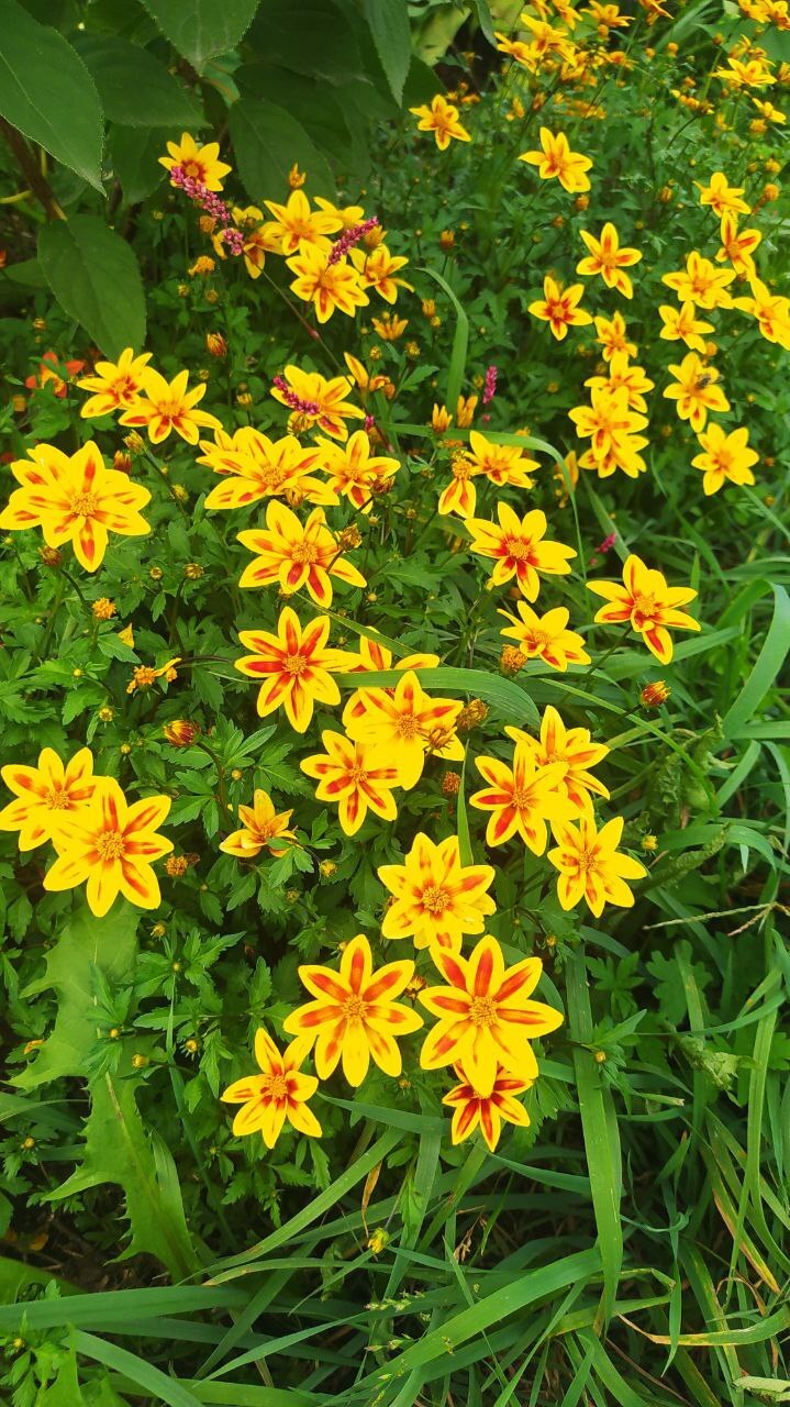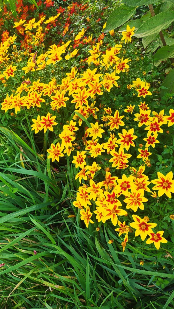 Биденс 'Блейзинг Стар' - действительно обладает очень красивой пылающей окраской: на фоне ярких желтых лепестков в форме ромашки идут крупные оранжевые штрихи по кругу, а в центре - махровый пумпон из множества тычинок. Издалека получается как цветок в цветке. Медовый аромат привлекает множество пчел. Куст компактный, не разваливается, шаровидной формы. Цветение обильное. При должном уходе может простоять до самых заморозков.
