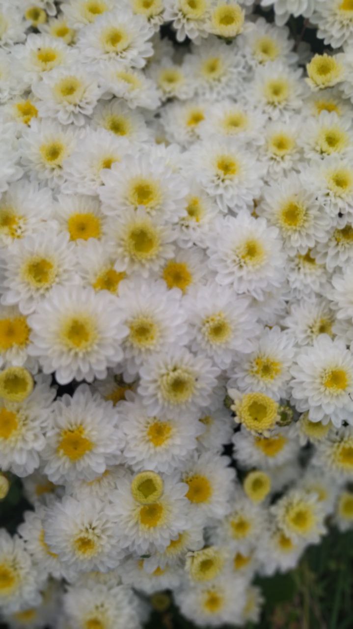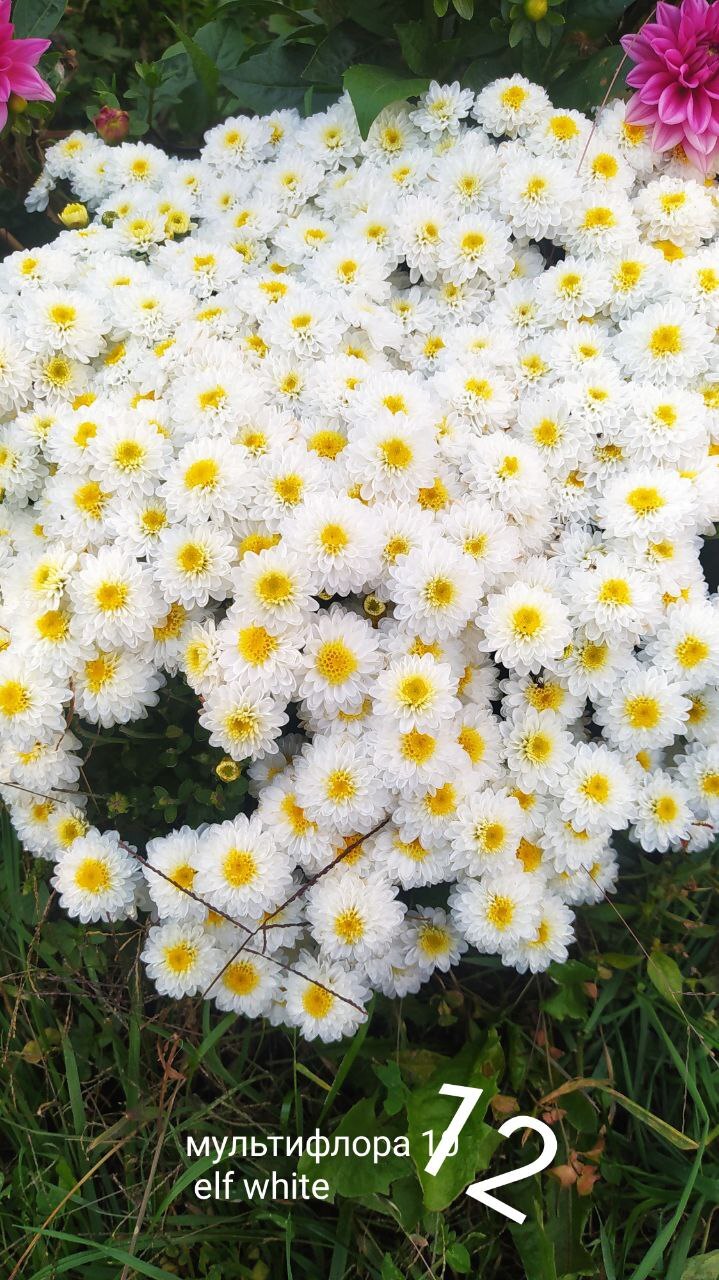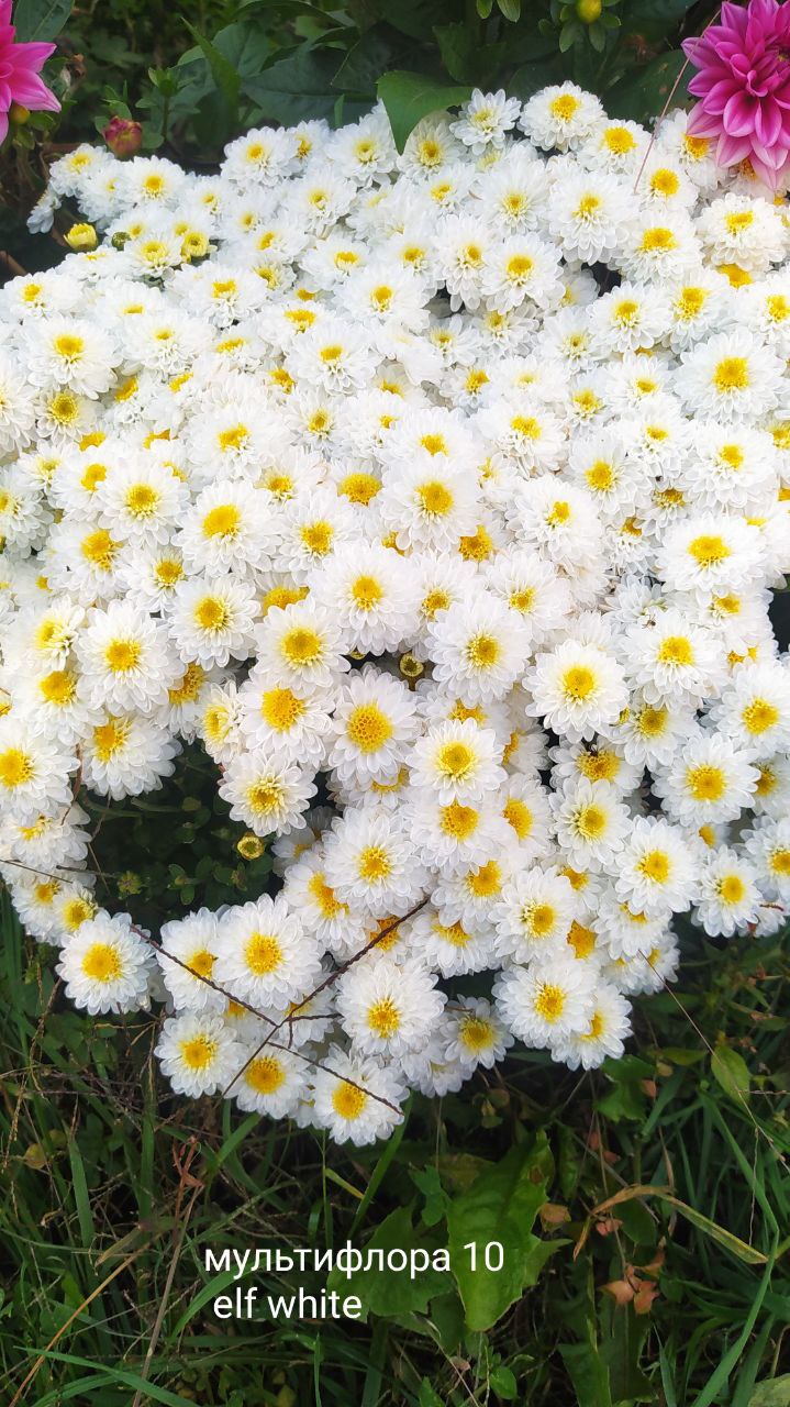 Плотный куст махровых белых соцветий с белой серединой. Сорт Elf White.