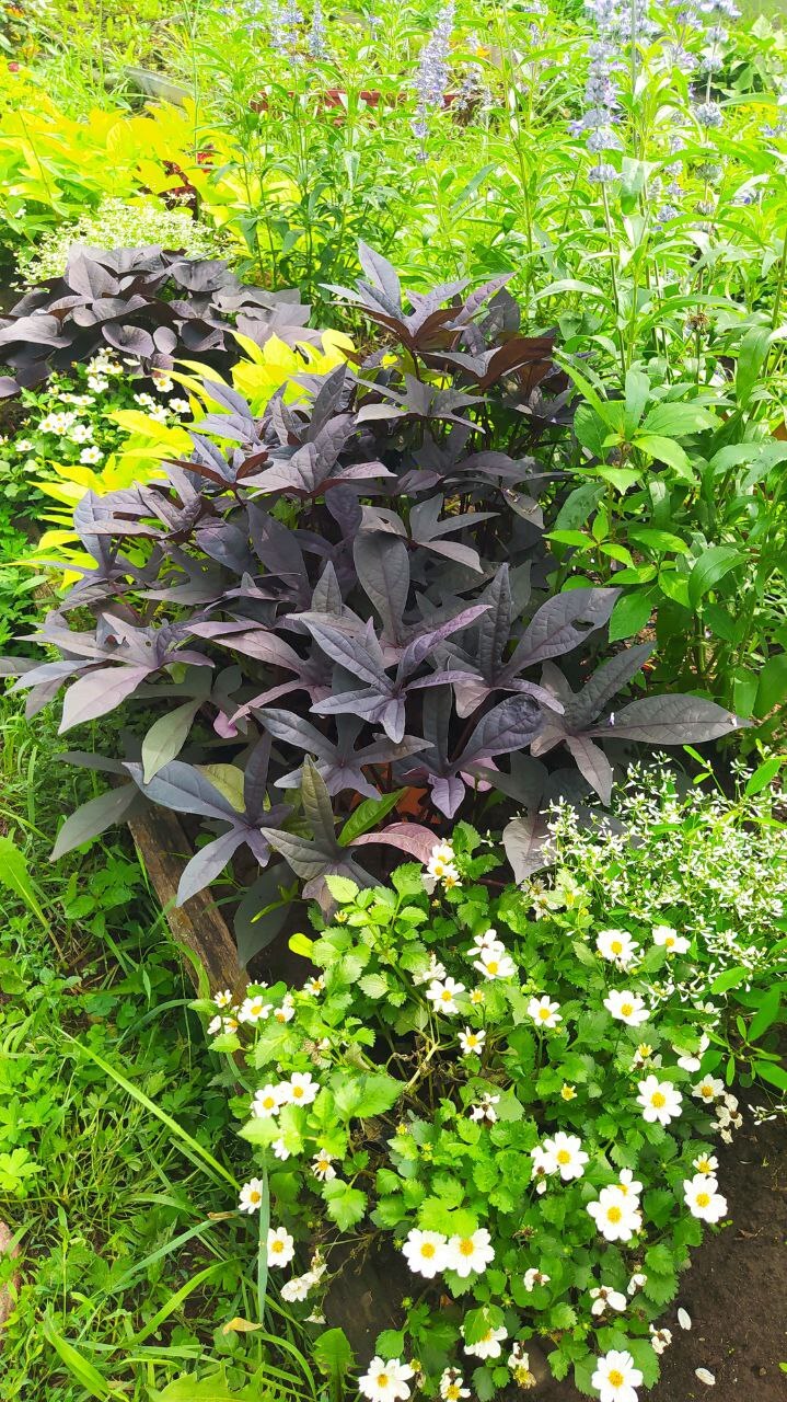 Ипомея батат Блэкки (Ipomoea batatas Blackie) – с рассеченными, удлиненными мечеобразными листьями, их окраска варьируется от густо-зеленого до темно-фиолетового и почти черного.