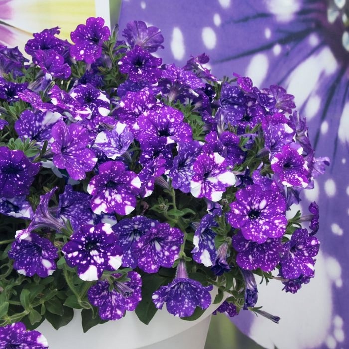 Ампельная петуния, образующая очень пышные, шарообразные шапки. Длина ветвей достигает 40-50 см. Имеет раннее, очень обильное цветение. Идеально заполняет крупные кашпо и вазоны. Высота куста: 15-20см Форма куста: ампельный, шарообразный. Прищипывание: обязательно. Петуния Surprise Sparkling Blue - это один из самых популярных и ярких сортов петунии, который привлекает внимание своей неповторимой красотой и необычной окраской. Сочетание синих и фиолетовых оттенков, с прожилками и переливами, делает этот сорт уникальным и незабываемым. Он подходит как для создания цветочных клумб, так и для выращивания в горшках и контейнерах.